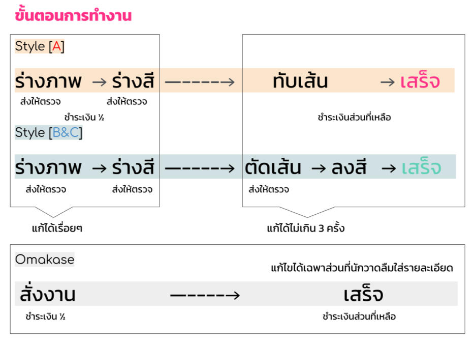● การแก้ไขในขั้นตอนร่างเส้นและร่างสีจะไม่คิดค่าใช้จ่าย แต่หากแก้ในขั้นตอนตัดเส้นหรือลงสีไปแล้วเกิน 3 ครั้งจะคิดค่าแก้ไขหลังจากนั้นครั้งละ 50 บาท (ยกเว้นคนวาดจะวาดผิดบรีฟเองจะไม่คิดค่าใช้จ่าย)