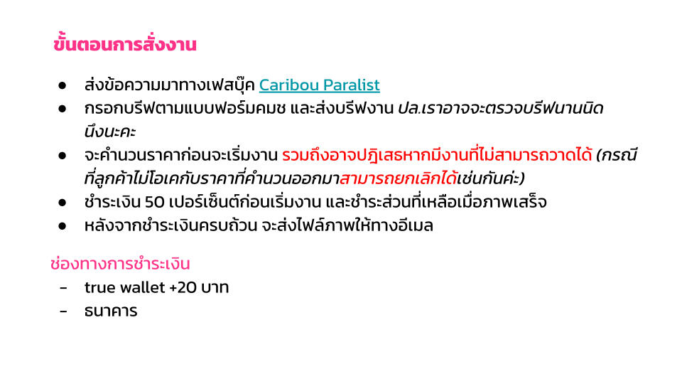 ● ก่อนเริ่มงานให้จ่ายมัดจำ 50 เปอร์เซ็นต์ของงาน และจ่ายส่วนที่เหลือหลังงานเสร็จ (หรือจะจ่ายรวดเดียวได้ตามความสะดวก)